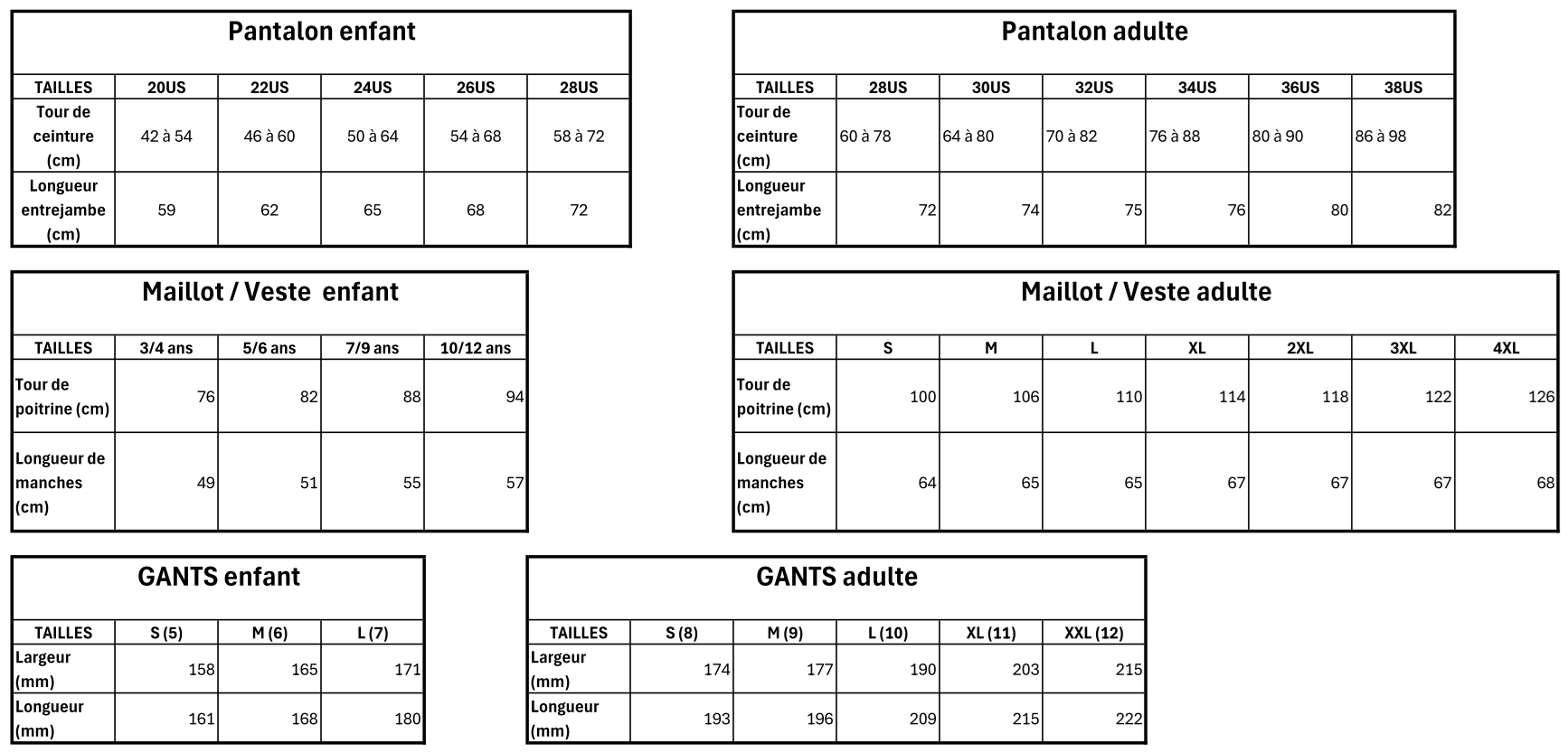 Ci-dessous le guide des tailles, prenez le temps de noter vos tailles selon ce tableau avant de passer commande.